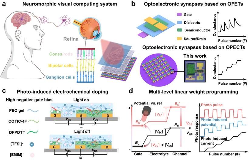 针对上述系列难题,研究团队通过异质结和离子掺杂设计,利用改进的光刻技术实现了晶圆级近红外有机光电化学晶体管的阵列化制备,并探究了其在类视觉感知中的应用。所制备的阵列器件展现出优异的均一性和近红外光感知特性,并在宽电导范围(47.3)内实现了超低非线性编程特性(-0.015)。此外,通过集成LED阵列和放大电路,构建了近红外视觉系统,实现了近红外图案的识别、记忆和可视化功能。进一步构建卷积计算系统,实现了对噪音手写数字的识别,展示了该研究在神经形态视觉感知系统领域的应用潜力。
