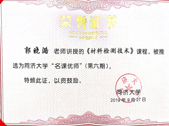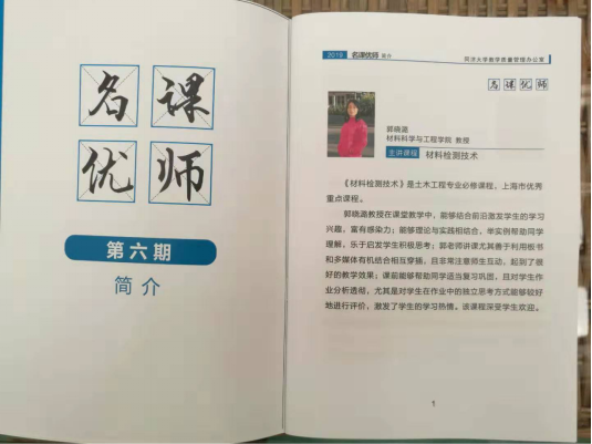 主讲人编撰的课程教材《建筑物无损检测技术》获评pg国际电子网站优秀本科生教材二等奖;依托该课程获全国卓越联盟高校青年教师创新大赛三等奖,全国无机非金属材料教学大赛二等奖和三等奖;pg国际电子网站名课优师、教学成果三等奖、育才奖、耀华教学奖、坤瑞泰隆新墙材教育奖、英才优青计划、英才骨干计划、三八红旗手、五四奖章提名奖等。