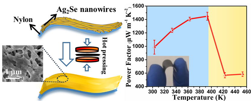 柔性热电材料能直接利用人体体温和环境的温差进行发电,可为爆炸式增长的穿戴式电子设备提供电源,因而近来受到了越来越多的重视。蔡克峰教授课题组发展了一种独特的研制柔性热电材料的方法:采用湿化学法制备硒化银纳米线,然后真空抽滤沉积到柔性的尼龙滤膜上,再低温热压获得了高性能的n型复合薄膜。硒化银膜室温的功率因子约为987mW m-1K-2(ZT值约为0.6),是至今报道的n型柔性热电薄膜中最高值之一;以此复合膜设计的4个单臂组成的原型器件在30 K温差下输出功率460 nW (功率密度约为2.3 W m-2)。同时,因为硒化银膜(由大长径比的纳米晶相互交织而成)与尼龙膜的协同作用,复合膜具有很好的柔性(绕直径10 mm的圆棒弯曲100次后电导率仍然保持原先的92%)。该方法为制备柔性的高性能热电薄膜提供了新的思路。