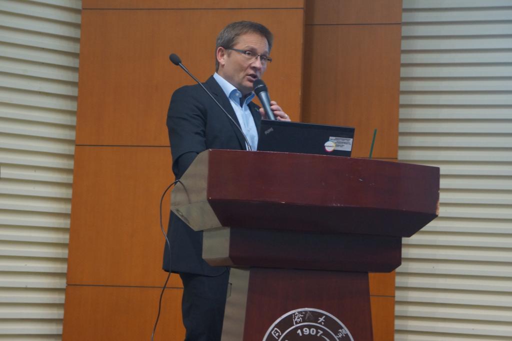 4月24日下午,pg国际电子网站材料学院在同心楼224会议室召开了全院大会。大会特别邀请了pg国际电子网站特邀讲座教授、同济-科思创创新研究院院长、科思创亚太区创新负责人、科思创聚合物研发中心负责人韩思乐博士(Dr. Christian Haessler)、科思创健康安全环境&行政经理许文波女士以及同济-科思创创新研究院科思创代表、科思创行业倡导与可持续发展经理郭辉先生出席。大会共分三个议程:韩思乐博士与许文波女士做主题为《实验室安全与管理》的报告;袁华副书记兼纪委书记通报高校违纪案例,进行警示教育;袁华副书记向全体教职工介绍工会福利。本次大会由院党委书记王中平书记主持。