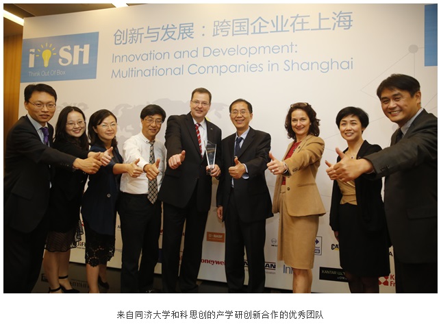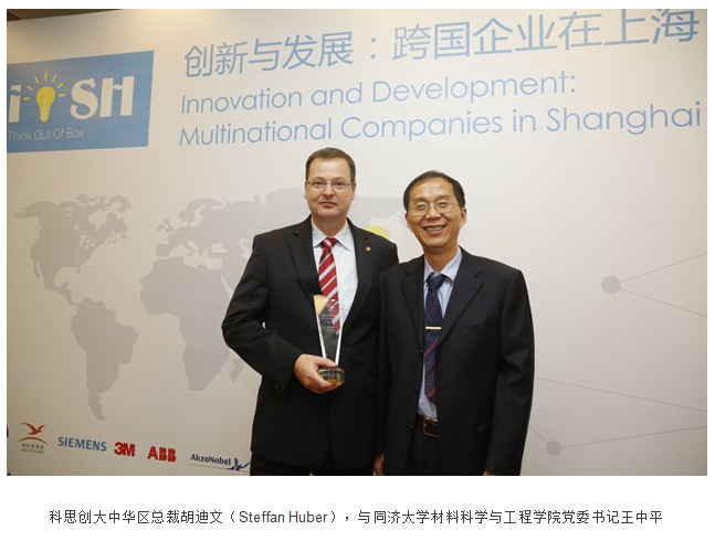在近日落幕的、由上海市人民政府新闻办、上海市商务委、上海日报和东方网等主办的“创新与发展:跨国企业在上海—最佳创新实践案例评选”大赛中,同济-科思创生态建筑与材料研究院凭借其在领域内产学研合作的丰硕成果,在入围的40个创新实践案例中脱颖而出,一举摘得“本土合作与创新”最佳创新实践案例奖。上海市政府新闻办副主任陈静溪、上海市商务委员会副主任顾军、杨浦区区委书记诸葛宇杰和区长谢坚钢等出席颁奖典礼,并向科思创大中华区总裁胡迪文(Steffan Huber)授予荣誉奖杯。