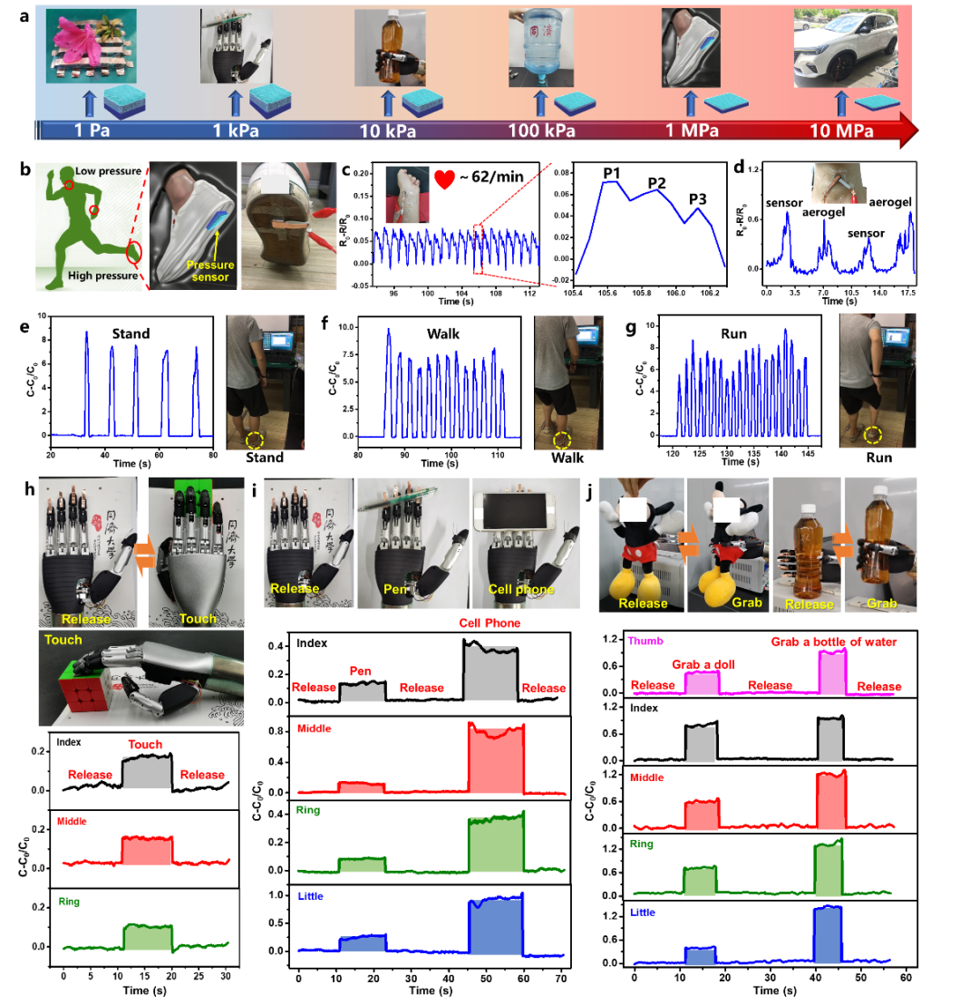 该梯度气凝胶基压敏电子器件可用于监测各种人体运动/生理信号和汽车轮胎的极端压力,并且穿戴在仿生手上可实现机器人或假肢的宽范围触觉感知(图3)。此外,该梯度气凝胶还具有优异的分离性能,可作为梯度分离介质进行污水净化。该工作提供了一种构建柔性梯度材料的通用策略,为下一代可穿戴电子器件、传感器、吸附/分离、电磁屏蔽、储能等研究提供了新思路。