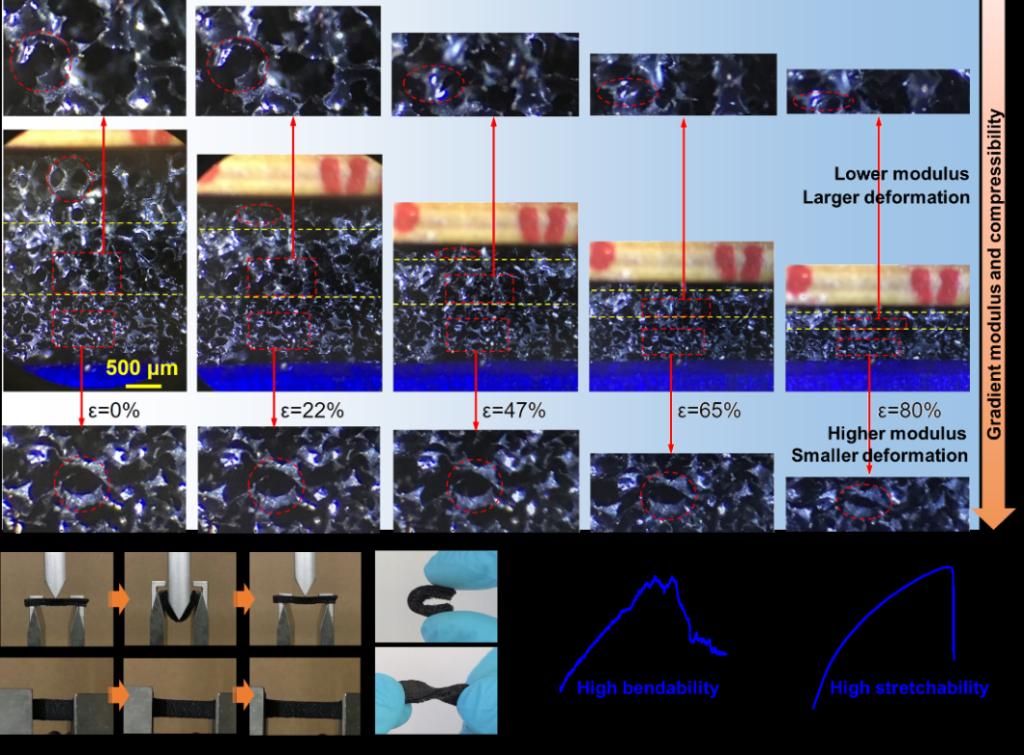 鉴于此,pg国际电子网站祖国庆课题组采用溶胶-凝胶/热压/冷冻铸造/常压干燥的新策略,构建了具有梯度模量多孔结构的可拉伸、超弹性还原氧化石墨烯(rGO)/聚氨酯(PU)纳米复合气凝胶(图1),实现了超宽响应范围柔性压敏电子器件。相关研究成果以“Bioinspired gradient stretchable aerogels for ultrabroad-range-response pressure-sensitive wearable electronics and high-efficient separators”为题发表在Angew.Chem.Int.Ed.上,并被选为VIP论文。