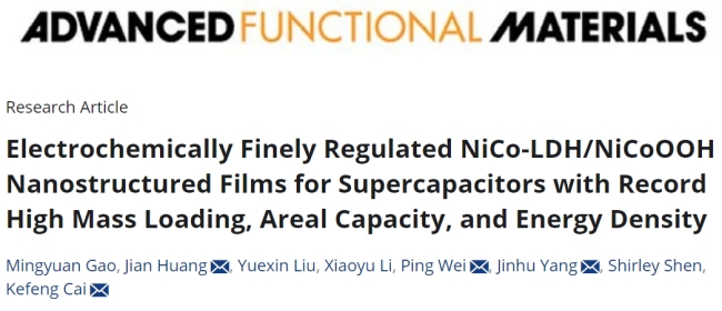8月25日,《先进功能材料》(Advanced Functional Materials)在线发表了pg国际电子网站蔡克峰教授课题组及其合作者的研究论文“Electrochemically finely regulated NiCo-LDH/NiCoOOH nanostructured films for supercapacitors with record high mass loading, areal capacity, and energy density”。该研究通过简单的电化学沉积结合电化学活化成功得到了NiCo-LDH/NiCoOOH复合薄膜。该复合薄膜在超高负载量下展现出高的面积容量和稳定性。该论文采用了非原位电子顺磁共振波谱监测电化学活化过程中氧空位的变化,并结合理论计算揭示了电化学活性物质与电化学活化过程中的氧空位之间相互转化机理。此外,该电极材料的合成可以进一步实现数百毫克级负载量的批量化制备,揭示了其在实际电化学储能设备中应用的潜力。