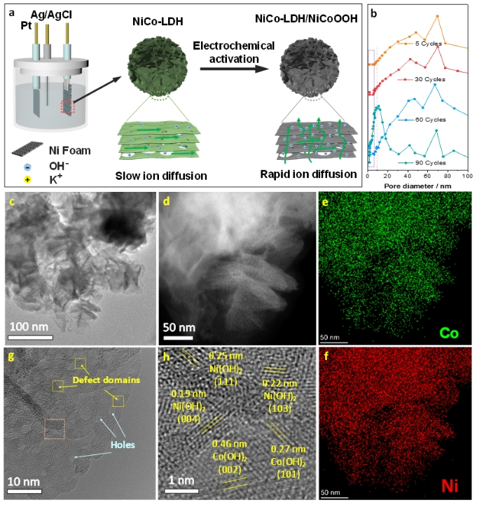 超级电容器作为一种极具发展前景的电化学储能系统,具有高功率密度、超长寿命和优异的倍率性能等优点,受到了人们的广泛关注。然而,低的能量密度是限制其发展的主要瓶颈。众所周知,提高能量密度的两种主要策略是最大限度地提高容量和组装混合电容器。虽然最近已经报道了在低质量负载(≤5mg cm-2)下具有预期容量的实验室规模电极,但当它们组装成混合电容器时,性能仍然不令人满意。因此,制备超高质量负载电极材料被认为是提高器件能量密度的有效策略。不幸的是,当质量载荷增加到≥10 mg cm-2时,由于离子扩散和电子传递缓慢,材料往往遭受严重的容量损失。除质量载荷外,电极孔隙率和活性物质厚度等也是重要的影响因素,其中微孔结构可提供丰富的离子吸附活性位点,中孔和大孔结构可作为快速电子传递和离子扩散通道。因此,合理的平衡和优化这些参数并设计一种同时具有高负载量和高容量性能的材料对于超级电容器的发展至关重要。蔡克峰教授课题组通过电化学沉积结合电化学活化的方法,构筑了兼具高负载量与高容量性能的复合薄膜,展现出超高的能量密度与稳定性。该研究提出了材料内部孔分布、缺陷位点与过渡金属氢氧化物活性物质相结合,设计兼具高负载量与高容量性能的概念,并且该策略有望在高能量密度储能器件中得以应用。