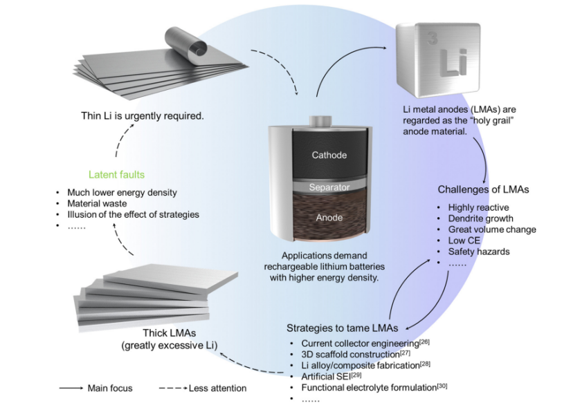 图1金属锂负极的前景、挑战、应对策略,以及减薄金属锂用于电池的直观逻辑