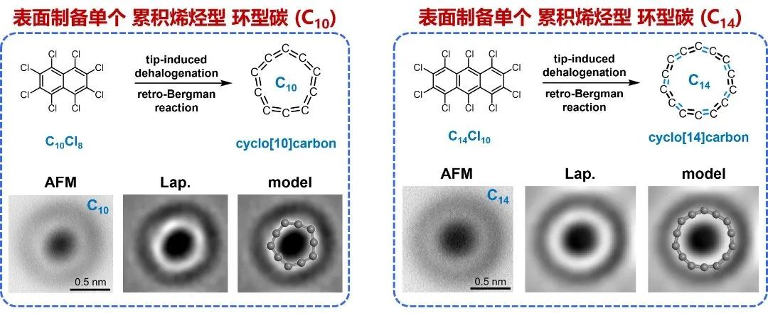 直到2019年,IBM实验室与牛津大学研究团队制备出单个的环型碳C18,首次从实验上验证了C18为单键和三键交替的聚炔型结构。然而,环型碳是一个大家族,对于更小的环型碳,它们的合成由于尺寸太小变得更具挑战性。此外,它们的结构和稳定性仍然让人难以捉摸。特殊的是,有理论预测C10是环型(n ≥ 10)和线型(n < 10)的分界点,同时也是最大的芳香性累积烯烃型环型碳。C14则被预测是从累积烯烃型C10到聚炔型C18的Peierls相变过渡态。因此,研究C10和C14的结构和稳定性具有极其重要的意义。只有将这2种全新的碳材料家族成员精准合成出来,方能精细表征它们的结构。