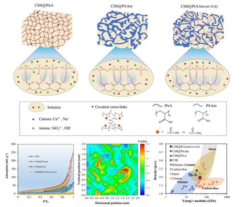 无定形的水化硅酸钙是水泥基材料的主要水化产物,对其力学性能和耐久性能具有重要作用。受自然生物启发的有机-无机复合策略旨在保证无机矿物的坚硬特性的同时,兼顾有机聚合物的韧性和轻质特性。然而,制备具有生物矿物介晶结构特征的有机无机复合材料具有相当大的挑战性。部分研究指出,亲水性和阴离子基团可以与C-S-H有很强的相互作用,但缺乏明确的实验证据来证明这两个条件是形成C-S-H介晶超结构的必要特征。