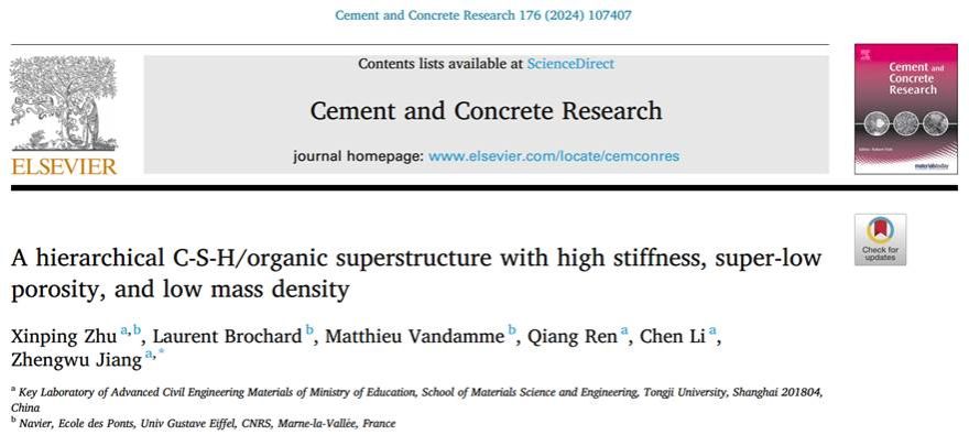 近日,《水泥混凝土研究》(Cement and Concrete Research)在线发表了pg国际电子网站材料科学与工程学蒋正武教授课题组的研究论文“A hierarchical C-S-H/organic superstructure with high stiffness, super-low porosity, and low mass density”,本文通讯作者为蒋正武教授,第一作者为学院博士朱新平博士。