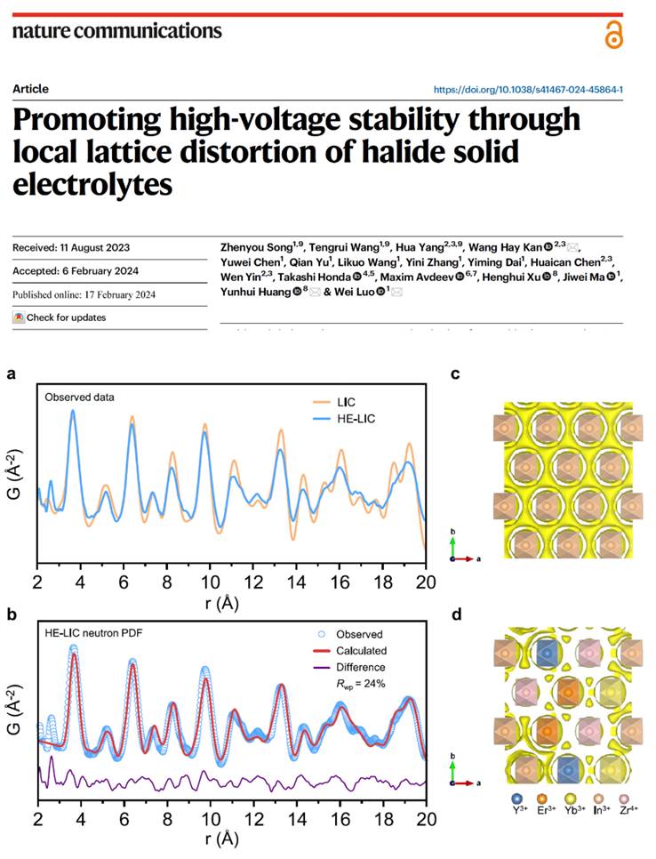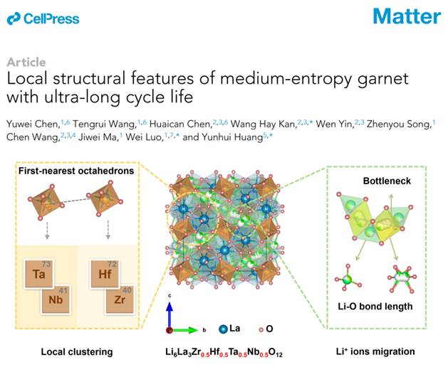 无机类固态电解质是实现高安全性和高比能固态电池的关键材料。无机材料中离子的迁移和耐氧化能力受到材料局部结构的影响,鉴于不同金属离子尺寸的差异,pg国际电子网站材料学院车用新能源研究团队与中国科学院高能物理研究所简宏希等人合作通过在晶格中引入不同离子来对局部结构进行调整,有效提升了固态电解质材料的离子电导率及电化学稳定性。研究成果以“Promoting high-voltage stability through local lattice distortion of halide solid electrolytes”和“Local structural features of medium-entropy garnet with ultra-long cycle life”为题分别发表于《自然·通讯》 (Nature Communications)和《物质》(Matter),pg国际电子网站博士生宋振友和陈雨薇为这两篇论文的第一作者。