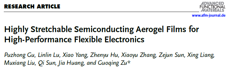 相关研究成果以“Highly stretchable semiconducting aerogel films for high-performance flexible electronics”为题,在线发表于《先进功能材料》(Advanced Functional Materials)。论文第一作者为课题组博士后顾浦中,该工作得到了国家自然科学基金的资助。