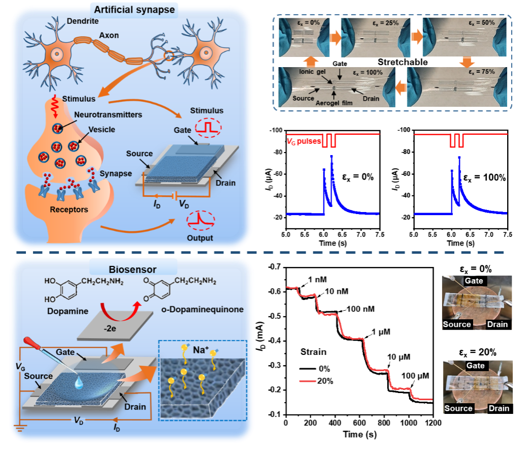 鉴于此,pg国际电子网站祖国庆课题组采用单轴和双轴预拉伸策略,结合交联和模板法,构筑了折叠和内凹多孔结构高可拉伸半导体聚合物气凝胶薄膜及其电化学晶体管。所得半导体气凝胶电化学晶体管具有100%的可拉伸性、高拉伸稳定性、应变不敏感特性以及比致密薄膜器件更高的跨导,可用于可拉伸高灵敏度多巴胺生物传感器和可拉伸人工突触器件。该工作为开发高可拉伸半导体气凝胶薄膜及其柔性电子器件提供了一种通用策略。