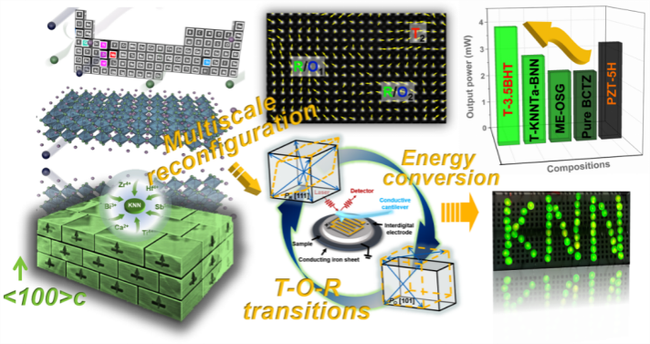 pg国际电子官网翟继卫教授研究团队为了弥补单纯采用NPB相界策略在KNN基陶瓷的压电性能改善过程中所带来的难以实现饱和极化问题,利用织构化工艺和中熵诱导NPB相界策略的协同优化,基于模板晶体生长法(TGG)以及两步烧结法制备了T-xBHT织构压电陶瓷,深入探究了多尺度重构对xBHT压电陶瓷性能的影响规律。所开发的中熵T-xBHT织构陶瓷具有优异的综合压电性能(d33 ~ 680 ± 35 pC/N, kp ~ 72.5%, Tc ~ 260 ℃),从而表现出优异的压电能量收集和超声换能特性,在无铅和铅基压电陶瓷中都具有很强的竞争力。综合结构分析表明,电场诱导多尺度极化配置的不可逆高效翻转促进了高饱和的极化。该项工作不仅展示了高性能KNN基压电陶瓷设计的新思路,并为压电性能和潜在的多尺度结构建立了密切联系。