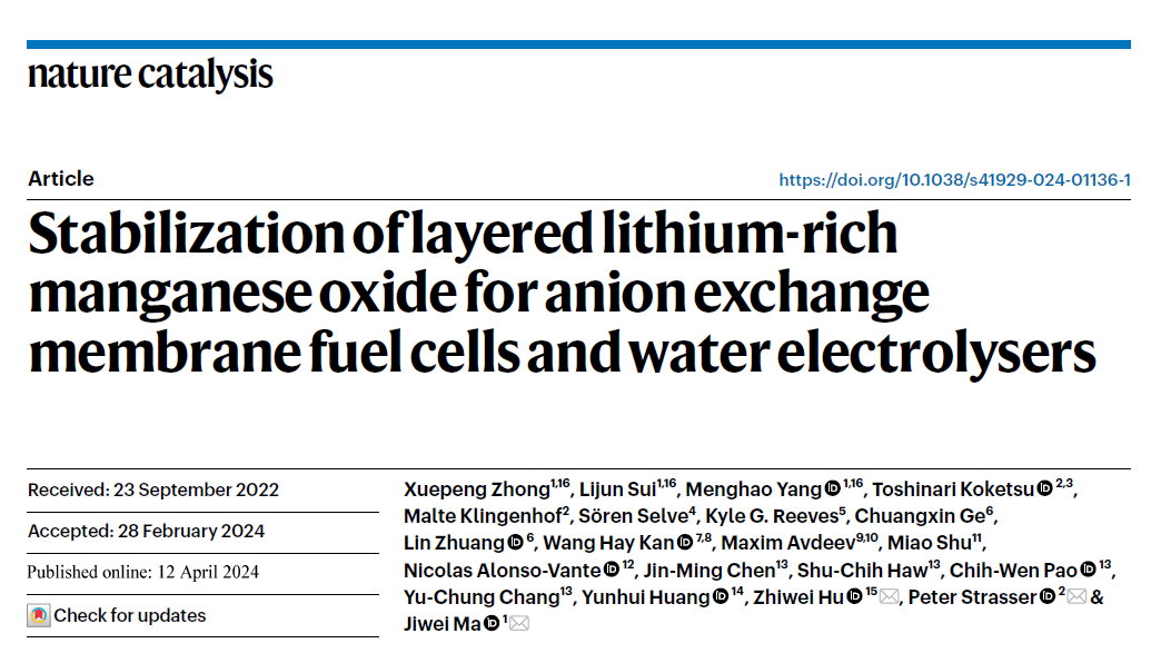 北京时间2024年4月12日17点,国际顶级期刊《自然·催化》(Nature Catalysis)在线发表了pg国际电子官网马吉伟教授团队的这一研究成果。论文题目为“Stabilization of layered lithium-rich manganese oxide for anion exchange membrane fuel cells and water electrolysers”。