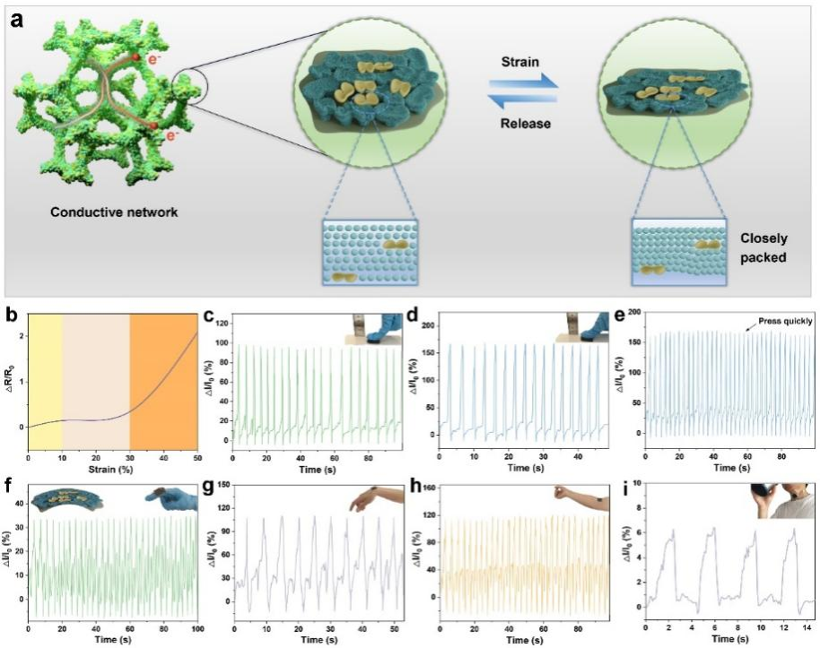 当珊瑚触手感知到微小的外部刺激时,会通过扩散的神经系统传递刺激信号。这种智能感知和电磁隐身一体化复合材料的电子皮肤功能类似于珊瑚触手,其受到外部刺激时,通过传输电路传递电信号生成用于决策的信息。即使对该复合材料进行多次压缩-释放,电流信号的变化都基本保持稳定,并且能准确地检测到压缩速度的快慢,表现出高重复性和高灵敏度。同时,其可作为皮肤传感器,通过感应人体运动并将触觉信息转换为电信号,为健康监测提供解决方案(图3)。