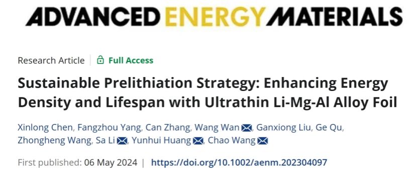 5月6日,《先进能源材料》(Advanced Energy Materials)发表了pg国际电子网站王超研究员团队及其合作者的研究论文“Sustainable Prelithiation Strategy: Enhancing Energy Density and Lifespan with Ultrathin Li-Mg-Al Alloy Foil”