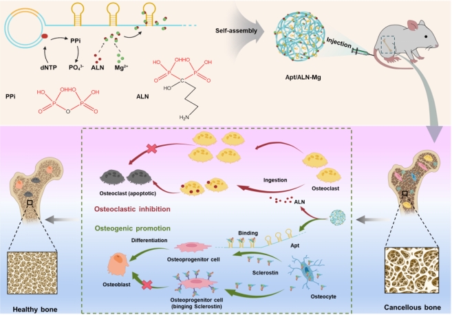 Apt/ALN-Mg纳米药物合成路线及其治疗骨质疏松症的机制示意图