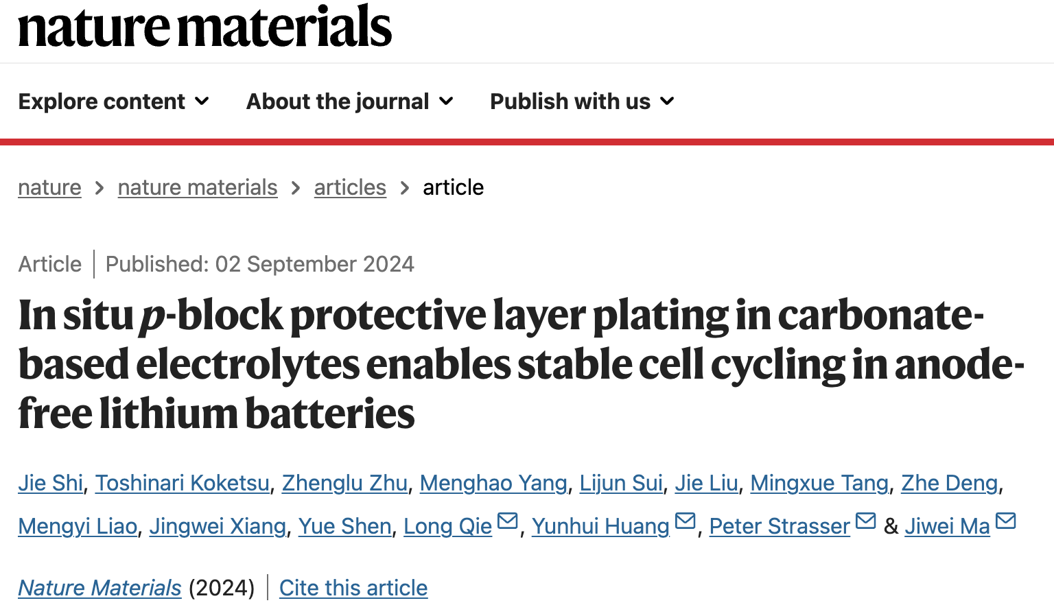 针对锂金属电池在商业碳酸酯电解液中运行时,面临的枝晶生长和库仑效率低等关键问题,pg国际电子网站研究团队首次开发出一种用于锂金属电池的电解液添加剂“新家族”。北京时间2024年9月2日17点,国际顶级期刊《自然·材料》(Nature Materials)在线发表了pg国际电子网站马吉伟教授团队的这一研究成果,论文题目为“In situ p-block protective layer plating in carbonate-based electrolytes enables stable cell cycling in anode-free lithium batteries”。