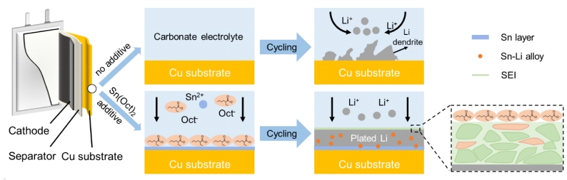鉴于此,马吉伟教授团队基于界面调控对其开展了研究,首次开发了能够在商业碳酸酯电解液中应用的P区金属添加剂“新家族”。该团队以辛酸锡添加剂作为研究模型,证实了在碳酸酯电解液中,辛酸根基团能够优先吸附在铜基底上,诱导形成非碳酸酯基的保护层,从而抑制副反应的发生并有助于形成均匀的锂沉积。同时,锡离子在初始阶段可优先形成稳定的亲锂合金层,增强铜基底对锂的亲和性。在该添加剂辅助下,采用商业碳酸酯电解液的无负极锂金属软包电池展现出良好的循环稳定性,库伦效率高达约99.1%。此外,研究团队也证实了这一家族添加剂同样适用于其它碱金属电池(如钠金属电池),具有高度的普适性。