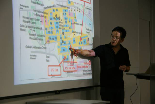 甲谷教授首先介绍了大阪大学的发展历史与现今概况,而后针对建筑通风原理与结构改良向同学们作了专题讲解。建筑工程专业出身的甲骨教授对于技术核心的把握精准透彻,他用简明扼要的语句解释清了研究中的建筑风洞实验过程,并幽默地以“为何你的邻居知道你的晚饭吃的是咖喱”这个问题抛砖引玉,引发同学思考,技术与设计上的独创更是令同学们啧啧称赞。