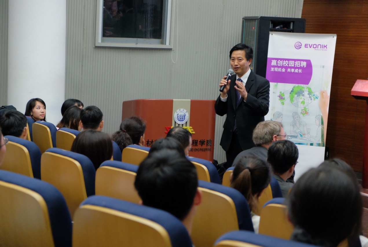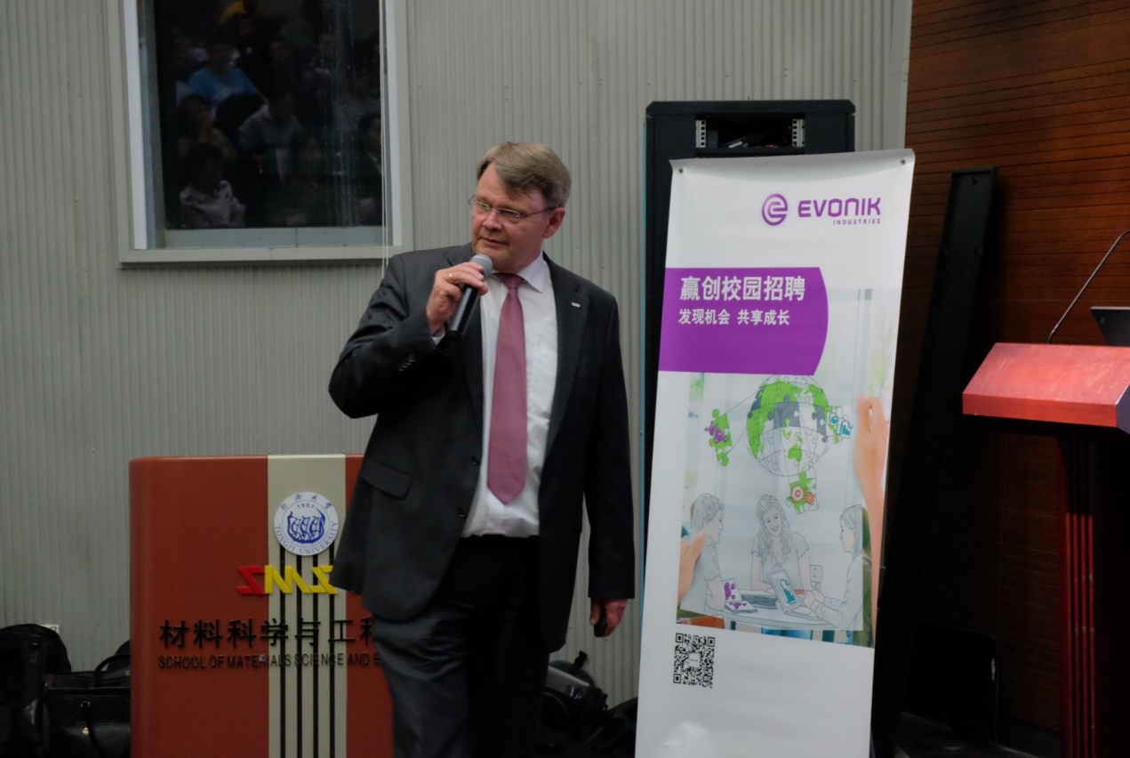 2016年10月17日晚,赢创2017同济首场招聘会在pg国际电子网站嘉定校区材料学院德才馆顺利举行。赢创大中华区总裁柯乐施(Dr Claas Klasen)博士、赢创特种化学(上海)有限公司总经理陈金秋博士、赢创德固赛(中国)投资有限公司人力资源总监程大年、赢创特种化学(上海)有限公司业务项目经理陆芳(同济校友)等做客宣讲会,学院副院长邱军、党委副书记王凌凌出席。来自同济、交大等高校的各专业的2017届本、硕学生约100人与会。