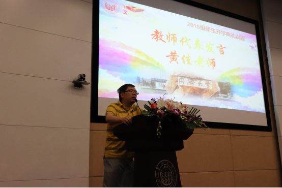 紧接着教师代表黄佳教授也向同学们表达了谆谆告诫与由衷祝福。黄老师希望同学们成为有独立思想的人,有责任心的人,优秀的人,有挑战精神的人,和正能量的人,教诲同学们刻苦努力,实现目标。