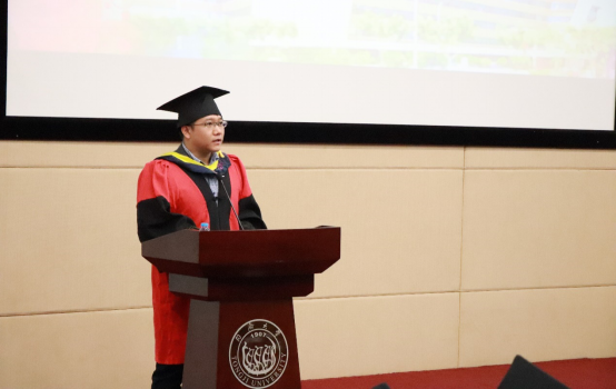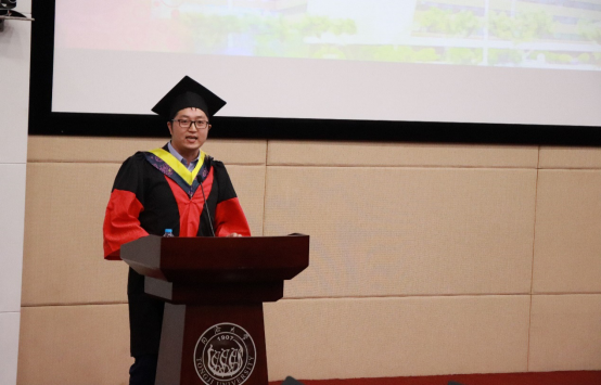 2018年上海市优秀毕业研究生、pg国际电子网站第十一届研究生“学术先锋”潘仲彬博士代表全体毕业生发言,他以人生选择和个人经历感慨学无止境,三载求学春秋,强大的信念支撑,一贯的坚持不懈,成就了自信满满、追求卓越的我们。他真挚感谢母校包容了我们的懵懂无知,孕育了我们的成熟睿智。大家相约,即便走得再远也要记得回来,特别为母校、材料学院的明天再留下一份情、一份心。无论何时何地,将同济人“同舟共济、自强不息”的精神发扬光大。
