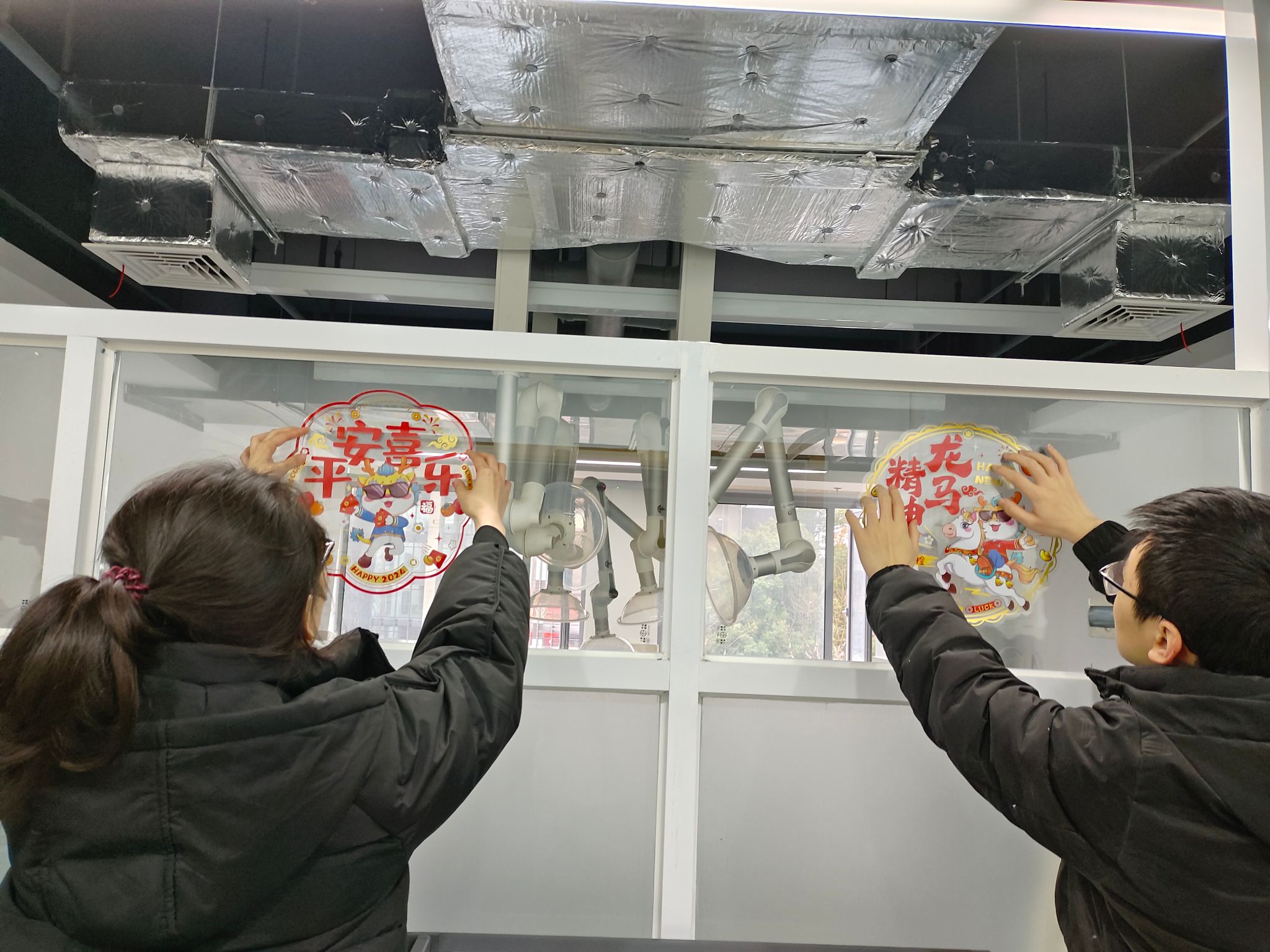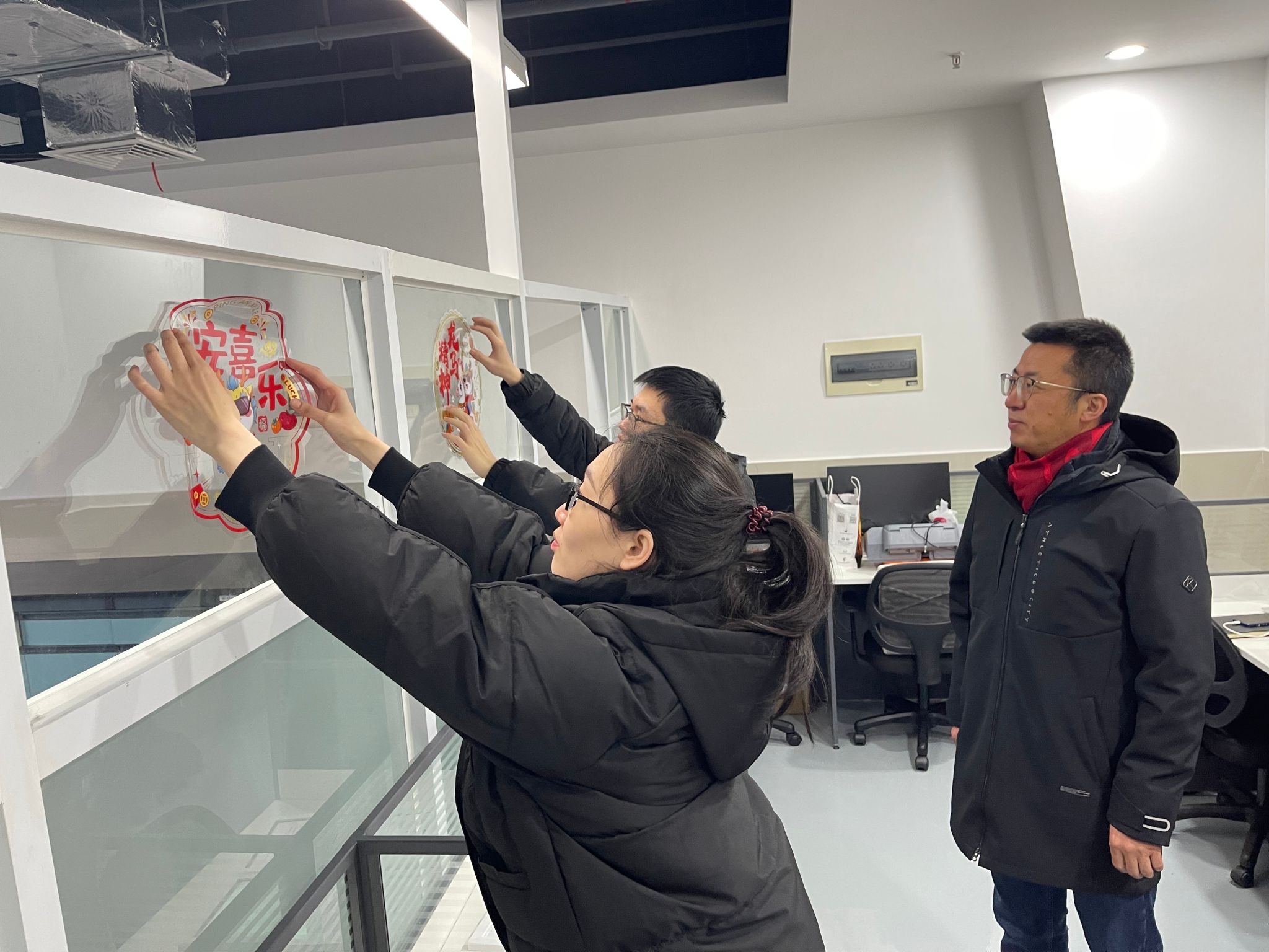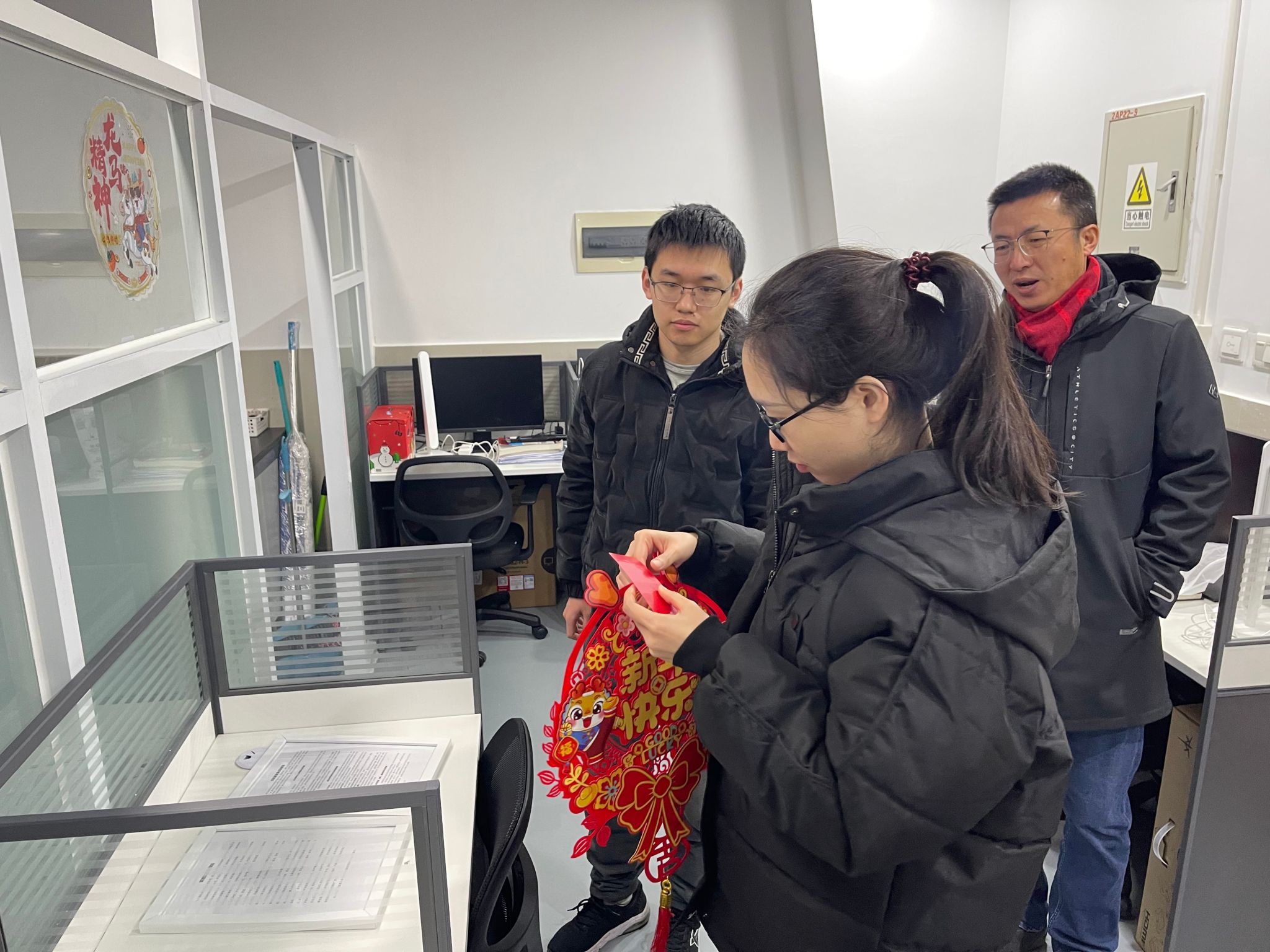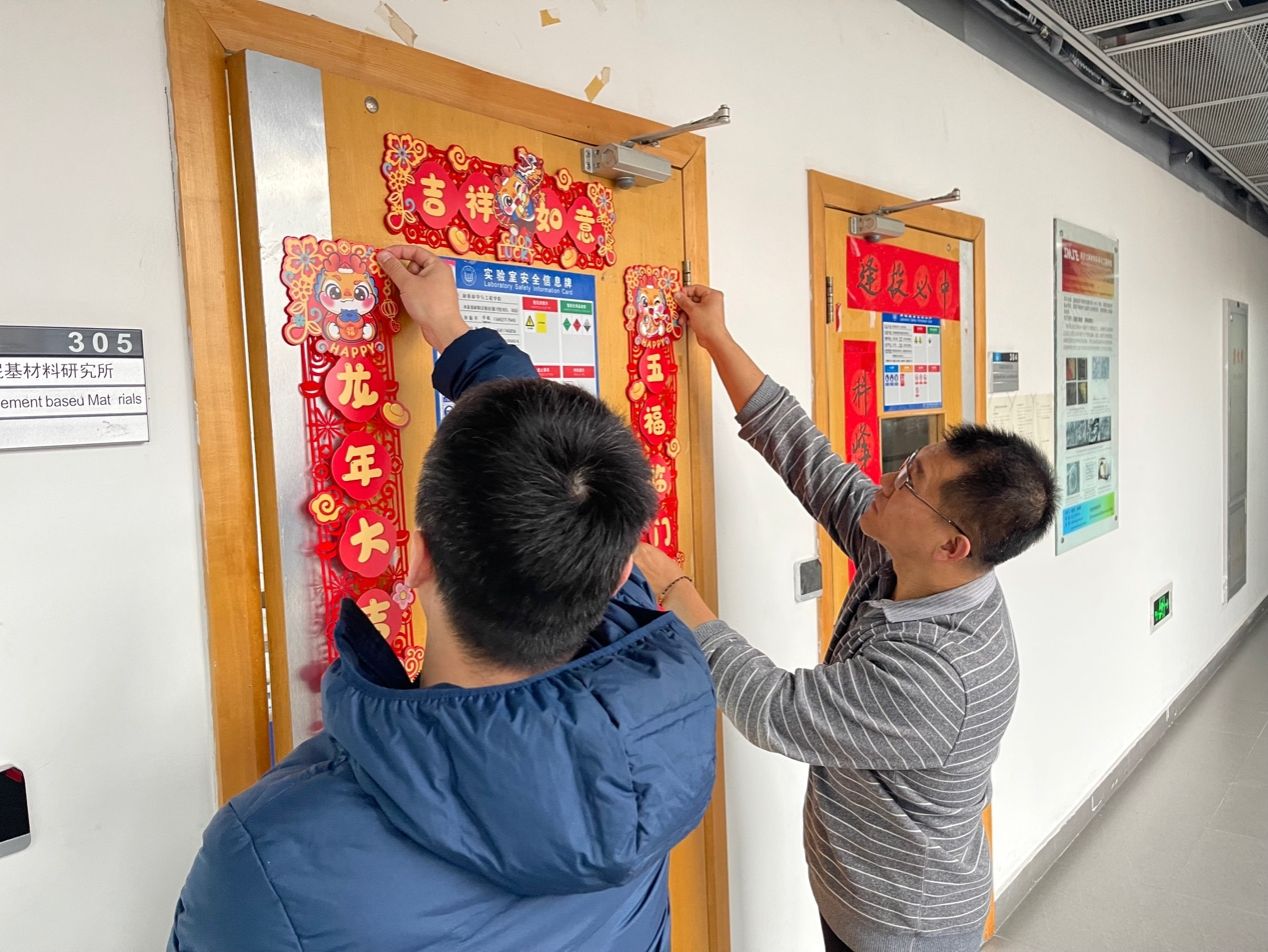 旨在为寒假坚持奋斗的每一位学子送达浓浓的关爱,2月1日,院长许维、党委副书记梁春江以及学生工作办公室老师一同走访实验室,看望并慰问了在校为科研拼搏的学生,通过亲切深入的互动交流,老师们全面了解学生寒假期间留校的原因或离校较晚的学生日程安排,询问了近期的学习、科研情况与生活需求,表示学院为留校学子开通科研测试绿色通道。同时叮嘱同学们寒假期间要注意劳逸结合,保重身体,遇到困难及时与学院的老师们联系,学院会尽全力帮助同学们解决。最后学院老师与同学们一起用活泼萌趣的龙年窗花、对联装点实验室,为大家送上了温馨的新春祝福,令莘莘学子感受到“材料大家庭”的温暖。