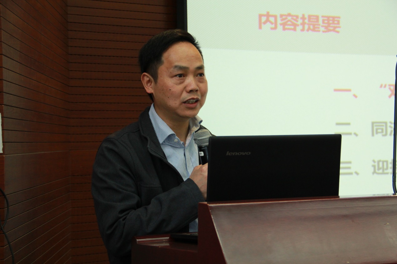 5月7日下午,学院2018-2019学年第二学期第三次全院大会在德才馆二楼报告厅召开,校发展规划部部长、高等教育研究所所长蔡三发受邀出席大会并作主题报告,学院党委书记王中平主持会议,学院党政领导班子成员、全院一百余名教职工出席会议。