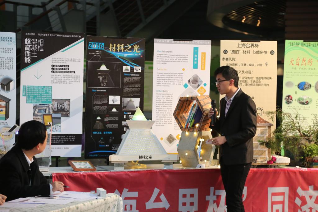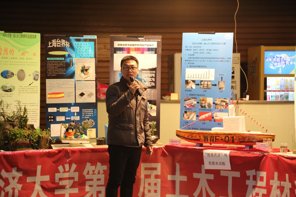 先是作品介绍阶段,各参赛组按次序由一名同学进行一段简短的作品介绍。不论是构思精巧的地聚合物书桌摆件系列,还是高端大气的“材料之光”,创意新颖的彩色透水混凝土,简洁轻盈的“砼舟共济号”……参赛队员们无不旁征博引,紧扣本次比赛的主题“节能与环保”侃侃而谈,使出浑身解数把作品和展板的精华浓缩在这1分钟里,真是字字珠玑,精彩介绍如连珠炮一般应接不暇,令人拍案叫绝。