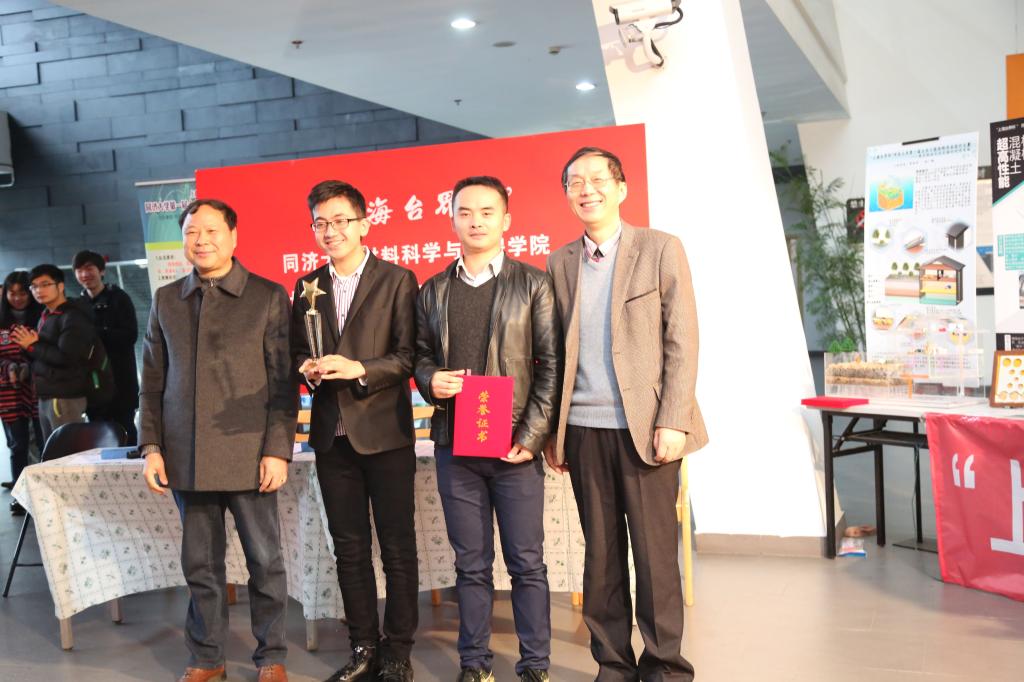 会场外阴云散去,雨势渐小;会场内讨论热烈,有声有色,这是11点的德才馆,真可谓“谈笑有鸿儒,往来无白丁”。不久后评分结束,主持人做了简短评议,然后在激昂的拉德茨基进行曲中宣布了获奖结果:一等奖的桂冠由“材料之光”摘得,实至名归;二等奖属于地聚物书桌摆件系列和彩色透水混凝土两组。学院党委书记王中平副教授等领导及来宾亲自为获奖队伍颁奖并合影。