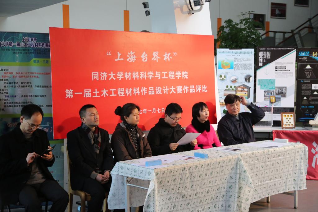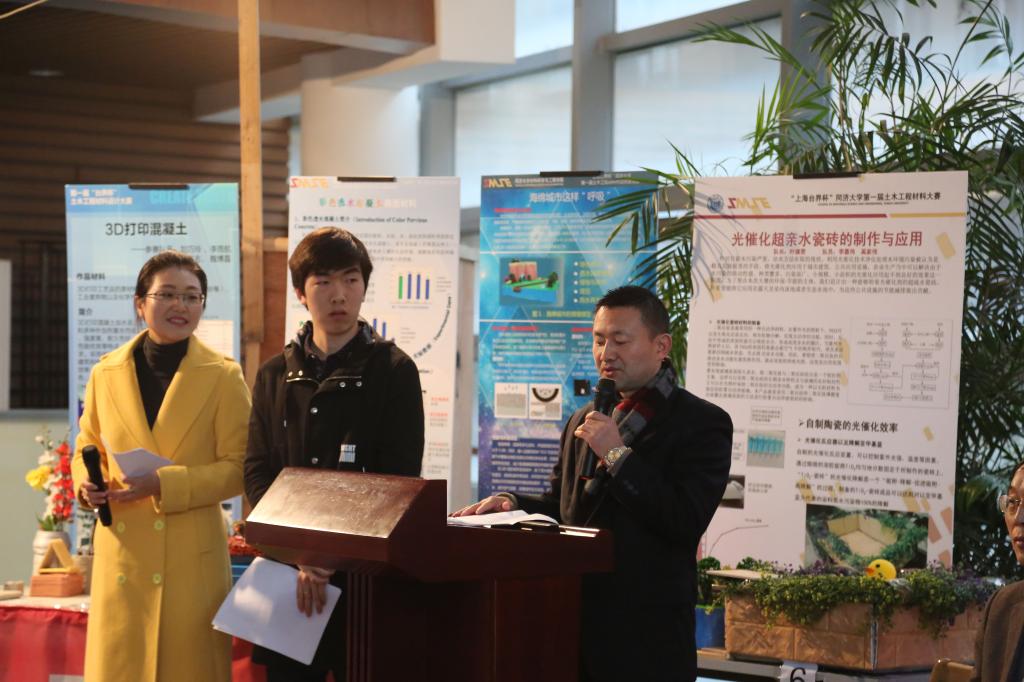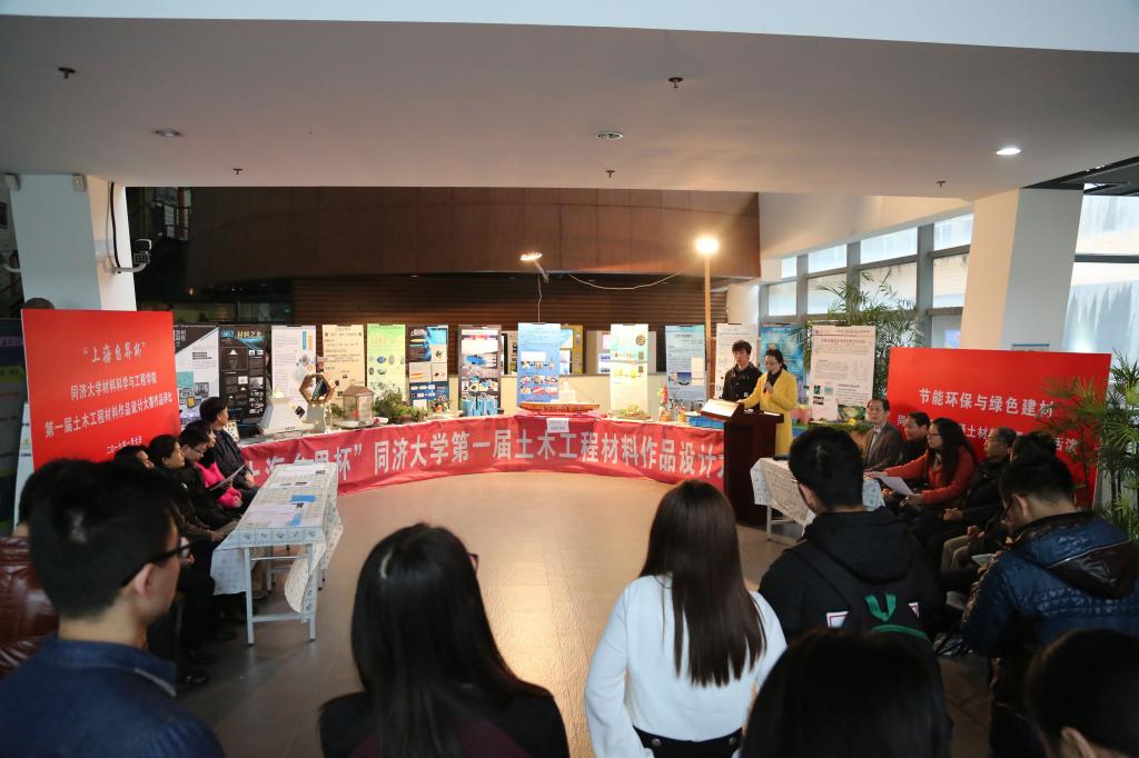 莅临指导本次活动的来宾和评委阵容不可谓不“豪华”:上海台界化工有限公司董事长邵田云先生,上海市建筑建材业市场管理总站主任、pg国际电子网站兼职教授贺鸿珠博士,上海城建设计院总工郭卓明教授级高工,上海城建物资有限公司总工徐亚玲教授级高工,pg国际电子网站党委书记王中平、副书记王凌凌,学工办宋文娟老师,材料学院资深教授王培铭老师和施惠生老师,无机材料系主任严彪老师,高分子材料系主任杜建忠老师,土木工程材料系主任孙振平老师、副主任蒋正武老师和支部书记张国防老师,以及朱洪波老师、吴凯老师等。