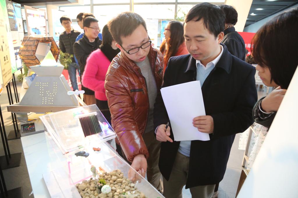 若将作品介绍比作精致的开胃小菜,那之后的问答环节就无疑是精神视觉双重意义上的饕餮盛宴:参赛组分三部分与评委们一同进入展区,组员们向评委们近距离展示作品细节,评委们也自由与各参赛队员详细交流,包括作品实用性、美观性,环保节能性,制作流程和参赛感受。参赛同学们谈到作品的优势时气定神闲,成竹在胸,而谈到作品的不足时同样直言不讳,落落大方,其间同学们所有表现都将成为评委们的评分依据。待所有介绍交流完毕,评委随即对作品、展板、讲演都细致公正地打出分数。比赛现场观众们和评委们的讨论声不绝于耳。