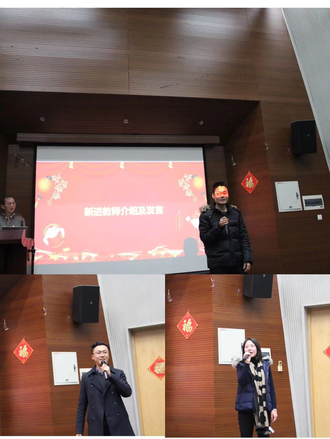 在送旧迎新环节,娄旻邦老师代表2019年度退休的教职工进行了发言,同时,2019年度新入职的4名教职员工(祖国庆、朱云卿、傅婧和高玉魁)分别进行了自我介绍。王中平书记代表学院对退休的教职工表示感谢,感谢他们的辛勤奉献,希望他们保重身体,科学合理的安排自己的晚年生活,常回来看看!同时,对新进老师表示欢迎,并希望他们今后能努力工作,为学院的发展贡献自己的力量。
