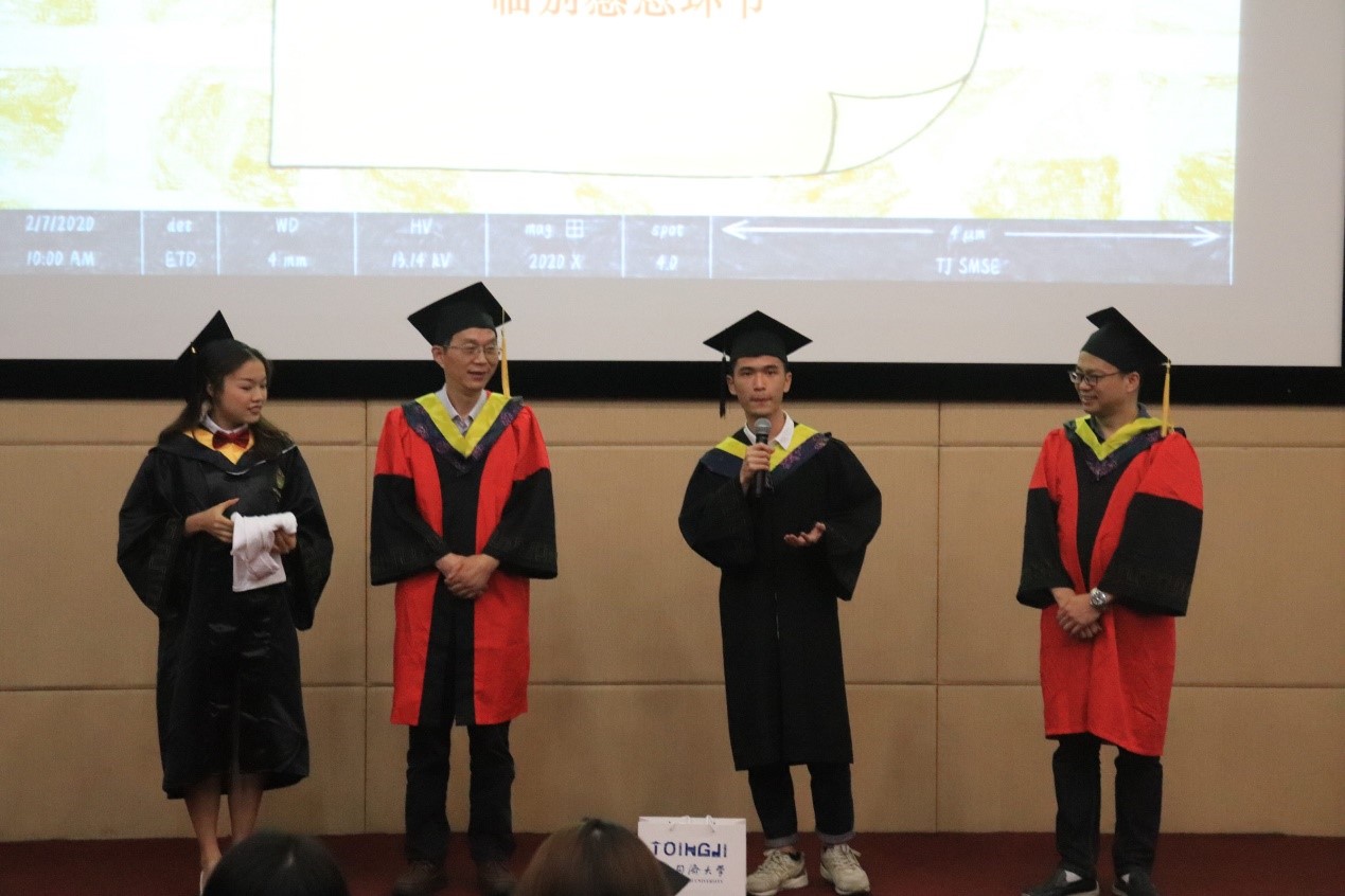 2020年上海市优秀毕业研究生丁元琪博士和上海市本科优秀毕业生何然同学分别代表全体研究生及本科毕业生发言。丁元琪博士回顾了与同济相伴的九个年头,见证了自身在导师的悉心引导以及学院的良好平台下,从一个对科研毫无概念的本科生逐渐成长为可以涉足学术领域的博士的过程。她强调,得到博士学位远远不是终点,但它意味着我们拥有了扎实的功底以及独立思考的能力,这将成为我们未来闯荡世界,遭遇挫折以及追逐梦想时的强大底气。何然同学以点滴细节带大家重温初入校园的心境,第一次在校园迷路,第一次夜晚辗转反侧,第一次品尝的食堂饭菜,第一节学习的课程,当初的热血澎湃仿佛就在昨天。临别降至,他希望同学们无论是奔赴工作岗位或是求学深造,均能牢记“同心同德同舟楫,济人济事济天下”的同济精神,乘风破浪,勇敢奔赴理想,永远年轻,永远热泪盈眶。