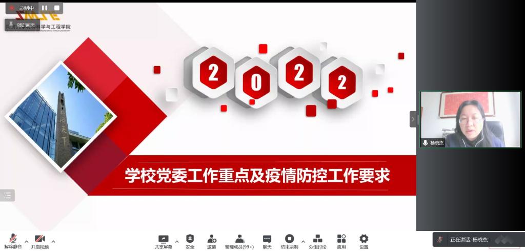 杨晓杰书记向大家传达了学校党委工作重点及疫情防控工作要求,指出,党中央高度重视教育工作,重视基础研究。传达了学校党委今年四个方面的工作重点:一是持续加强政治建设,强化新时代高等教育的初心使命。二是牢牢把握根本任务,培养一流人才。三是坚持夯实党建基础,引领改革发展。四是牢固树立底线思维,保障安全稳定。同时部署了学院党委2022年工作重点,布置了准封闭管理期间学院防疫工作方案。杨晓杰指出,今年是第二轮“双一流”建设的起步年,新年新机遇新挑战,孕育着新希望,学院师生要凝心聚力,满怀信心,趁势而上,砥砺前行,跑好我们手中接力棒,推动学校事业发展迈上新台阶,用实际行动迎接党的二十大胜利召开!