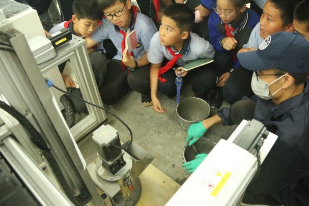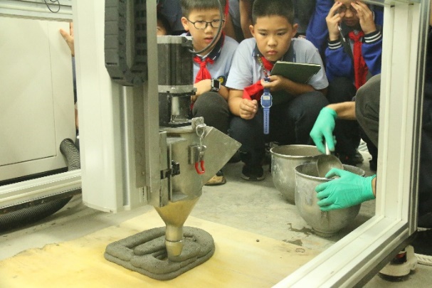 走进3D打印实验室, 3D打印介绍视频正在播放,桌上展示着以往打印的各式样品。在认真观看观摩后,中学生们与研究生们携手合作,研究生上机演示混凝土3D打印过程,并与孩子们一起打印了同济附中校徽。同学们非常好奇,提了很多问题,例如“我们住的房子也可以这样打印出来吗”、“怎么把打印机送到月亮上呢”,硕士博士研究生们一一为同学们作了解答。