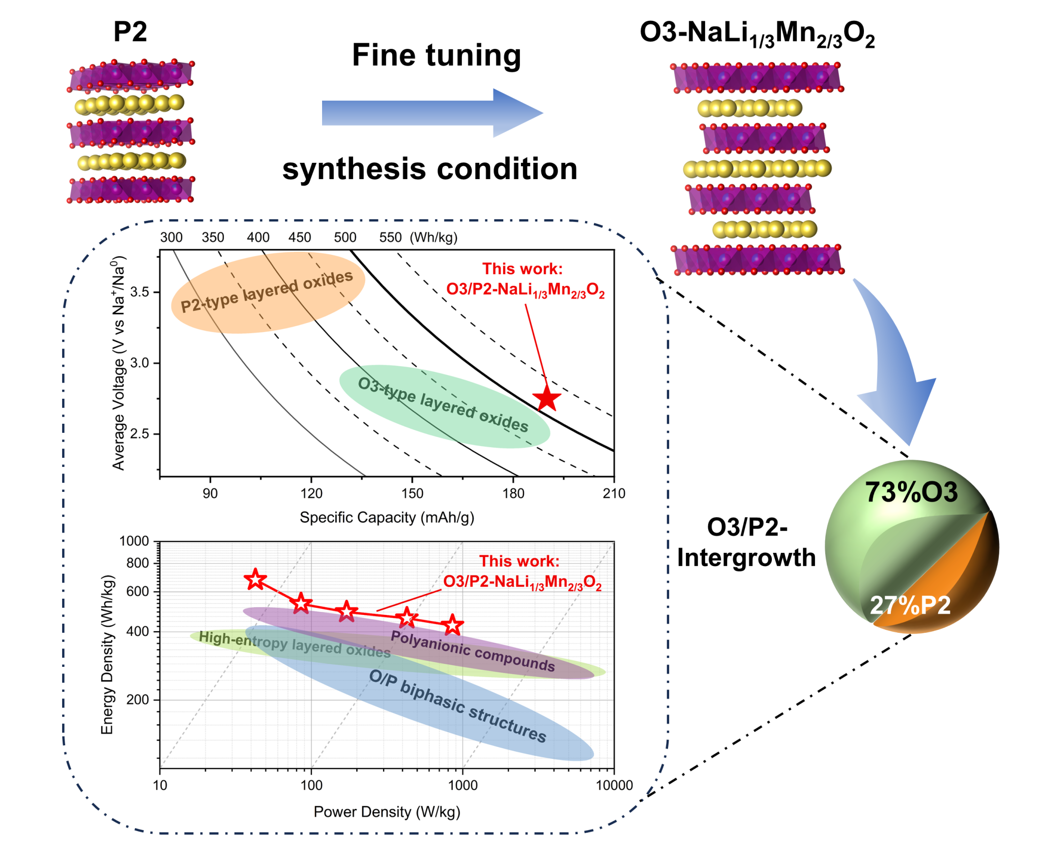 钠离子电池在近年来得到了快速发展,尤其是正极材料组分被广泛研究。其中层状过渡金属氧化物兼有低成本与高性能特点,被认为是极具潜力的商用正极材料之一。围绕如何提高这类材料的比容量和倍率性能,pg国际电子网站马吉伟教授团队提出了一种新的解决方案,即通过调整合成条件控制了O3-NaLi1/3Mn2/3O2中P2的共生比例。7月16日,相关研究成果以“Enhancing Reversibility and Kinetics of Anionic Redox in O3-NaLi1/3Mn2/3O2 through Controlled P2 Intergrowth”为题发表于《德国应用化学》(Angewandte Chemie International Edition)。