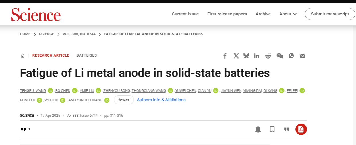 固态锂电池为何失效?pg国际电子网站研究团队给出了新机制。北京时间4月18日凌晨,《科学》(Science)在线发表了pg国际电子官网罗巍教授与合作者题为“Fatigue of Li metal anode in solid-state batteries”(固态电池锂金属负极的疲劳)的研究论文。该研究首次发现了固态锂电池金属锂负极疲劳失效现象,揭示了疲劳失效新机制,并提出了抑制疲劳失效改善固态电池性能的新策略。