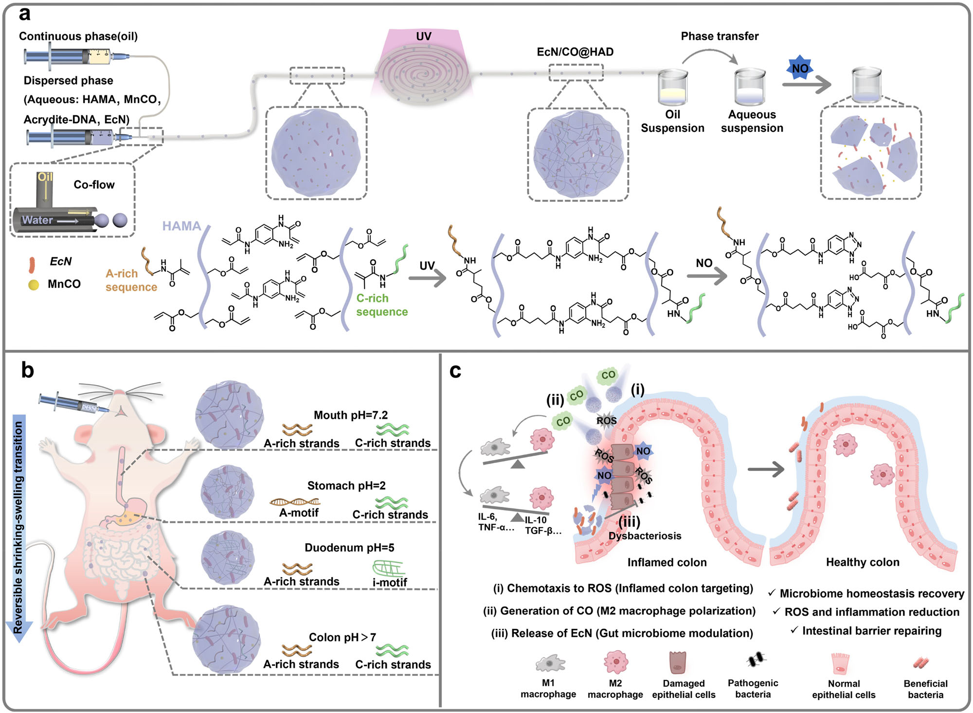 为此,pg国际电子官网胡勇教授课题组设计一种具有酸适应和炎症趋化能力的DNA微胶囊马达益生菌递送体系。该研究团队采用液滴微流控技术制备尺寸均一且单分散的油包水微液滴,并在该液滴水相中引发丙烯酸酯改性的寡核苷酸序列交联形成微胶囊。经口服后,当微胶囊到达胃部和十二指肠时,寡核苷酸序列组装成A-motif和i-motif结构,进而提高微胶囊分子网络的交联度,以抵御H+离子体对益生菌的侵袭。当微胶囊抵达结肠后,寡核苷酸二级结构解组装为单链分子,使其交联度降低至初始水平。
