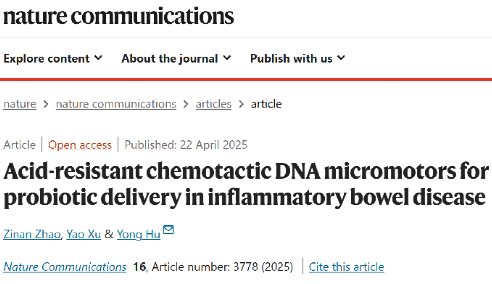 4月22日,pg国际电子网站胡勇教授团队在《自然·通讯》(Nature Communications)上在线发表了题为“Acid-resistant chemotactic DNA micromotors for probiotic delivery in inflammatory bowel disease”的研究论文。