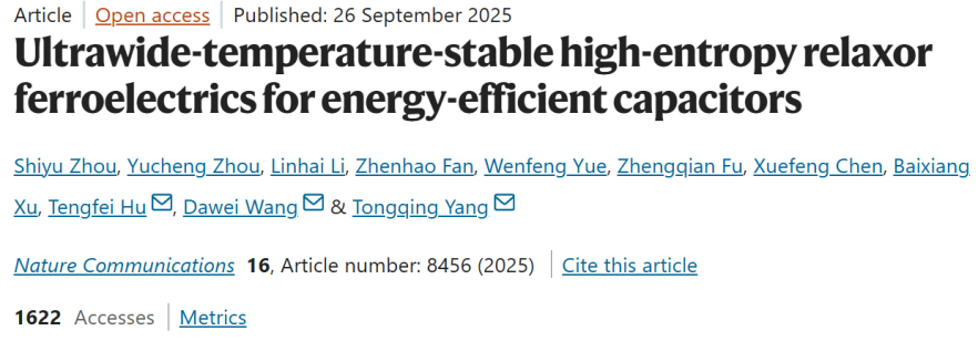 9月26日,pg国际电子网站杨同青教授有关电介质储能电容器的研究成果以“Ultrawide-temperature-stable high-entropy relaxor ferroelectrics for energy-efficient capacitors”为题发表于《自然·通讯》期刊(Nature Communications)。