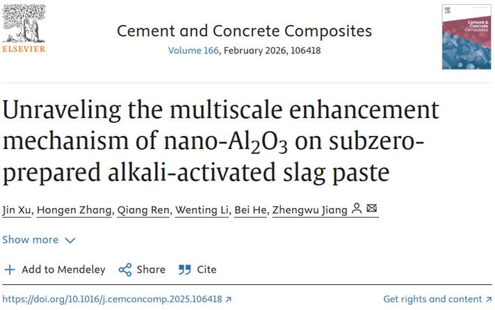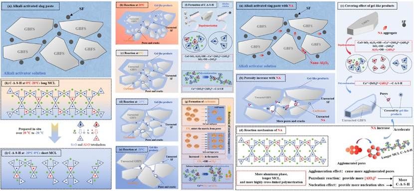 碱活化矿渣浆(AASP)因其较低的冰点,展现出在寒冷地区原位负温制备的潜力,而纳米材料的引入可促进其在低温下形成致密结构,是提升负温力学性能的关键途径。团队聚焦AASP20℃-20℃范围内的原位制备行为与多尺度表征手段,深入揭示了纳米氧化铝(NA)在负温下的改性机制。研究成果以“Unraveling the multiscale enhancement mechanism of nano-Al2O3 on subzero-prepared alkali-activated slag paste”为题发表在《水泥混凝土复合材料》(Cement & Concrete Composites)。第一作者为博士研究生许劲,通讯作者为蒋正武教授。