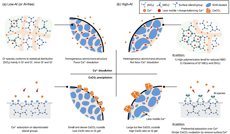团队研究发现,铝原子形成带负电的四面体结构,并与硅氧四面体优先结合为高聚态的原子团簇,使玻璃体中的非桥氧浓度降低、阳离子迁移性能减弱,不利于材料的碳化。在碳化反应过程中,铝质组分溶解并在玻璃颗粒表面产生特性吸附,抑制碳酸钙的成核并影响其形态特征(图1)。研究成果为深入理解固废碳化反应的过程与机制提供理论思路,也为工业固废碳封存技术的发展提供支撑。