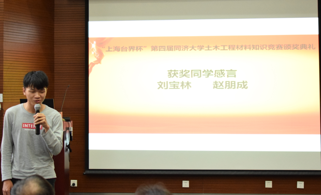 一等奖获得者刘宝林和赵朋成两位同学分别发表了获奖感言。他们均对竞赛主办方和协办方表示由衷感谢,认为土木工程材料系倡议发起的土木工程材料知识竞赛,对于在读大学生们来说,是每年热切期待的一项赛事,可以帮助同学们找到努力的方向,了解并深入学习一门专业知识并进行认真思考。赵朋成同学说:“参加这次比赛,有助于我们夯实专业基础,建立完善的知识体系,使我们在面临实际问题并想方设法解决问题的过程中加深对土木工程材料的认识。因此我特别感谢主办方和赞助方!”他还说:“当代青年要有激情和力量。一代人有一代人的使命,一代人有一代人的担当。中华民族站起来的近代史,是用血泪书写的斗争史;中华民族富起来的现代史,是用汗水书写的奋斗史。而我们这一代的使命是让我们的民族强起来,我想,我们的历史是用智慧书写的历史,因为这个时代的命门是科技。而不论在哪个历史时期,学生时代总是最富有激情、最富有创造力的时期。恰同学少年,风华正茂,望吾辈能求真学问,练真本领,心中有阳光,脚下有力量。”