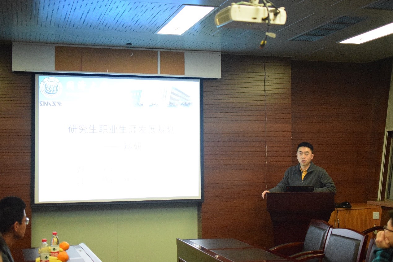 讲座的上半场由向震博士为同学们带来扎根于科研的研究生职业生涯发展规划,作为一名博士后,他首先向同学们分享了自己选择攻读博士的初衷。他说攻博确实是一个非常艰苦与漫长的过程,但如果真心的热爱自己所从事的行业,读博仍然是最好的选择。同时面对同学们所表达出来的对于攻博的疑惑与不安,他也打趣道:确实,读博可能面对着很多很现实的问题,诸如家人甚至是另一半的压力,这就需要同志们拿出做学问养成的攻坚克难的信念和意志