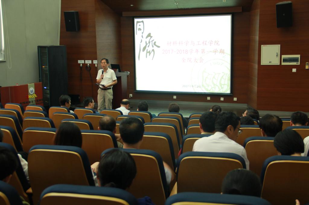 9月26日下午,材料学院2017-2018学年首次全院大会在德才楼二楼报告厅召开,学院教职员工100余人出席会议,学院党委书记王中平主持会议。